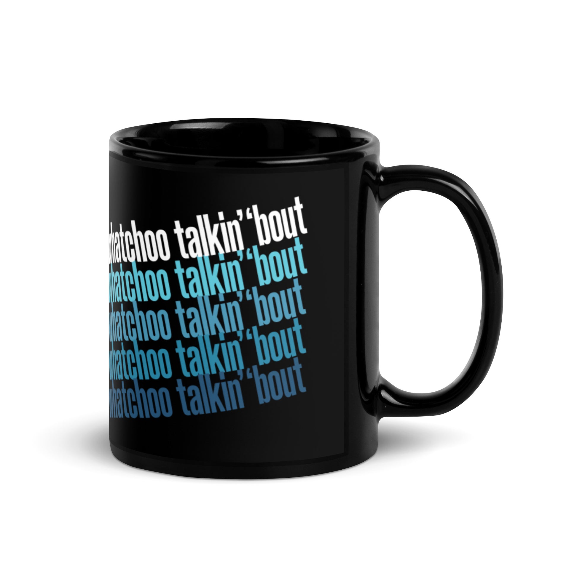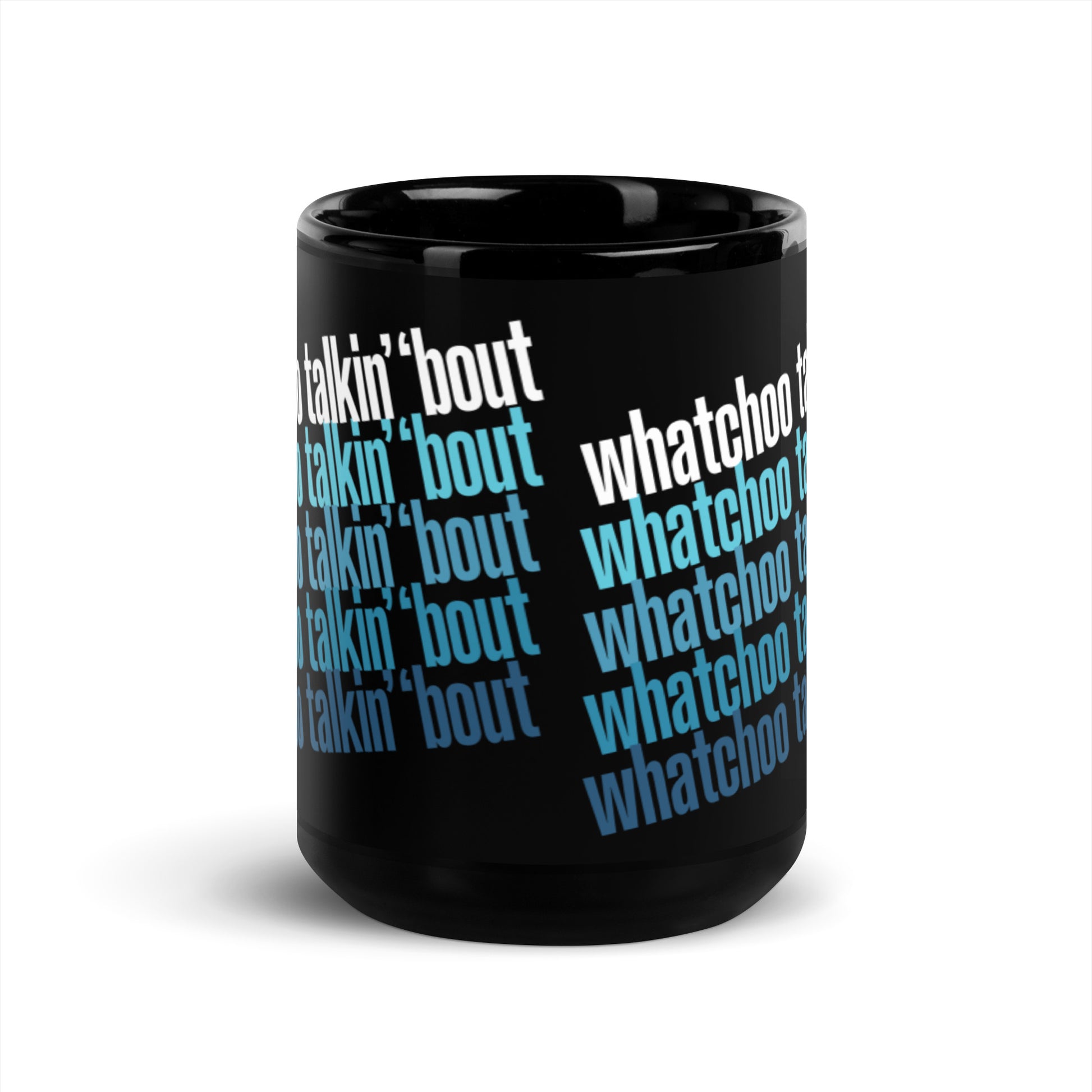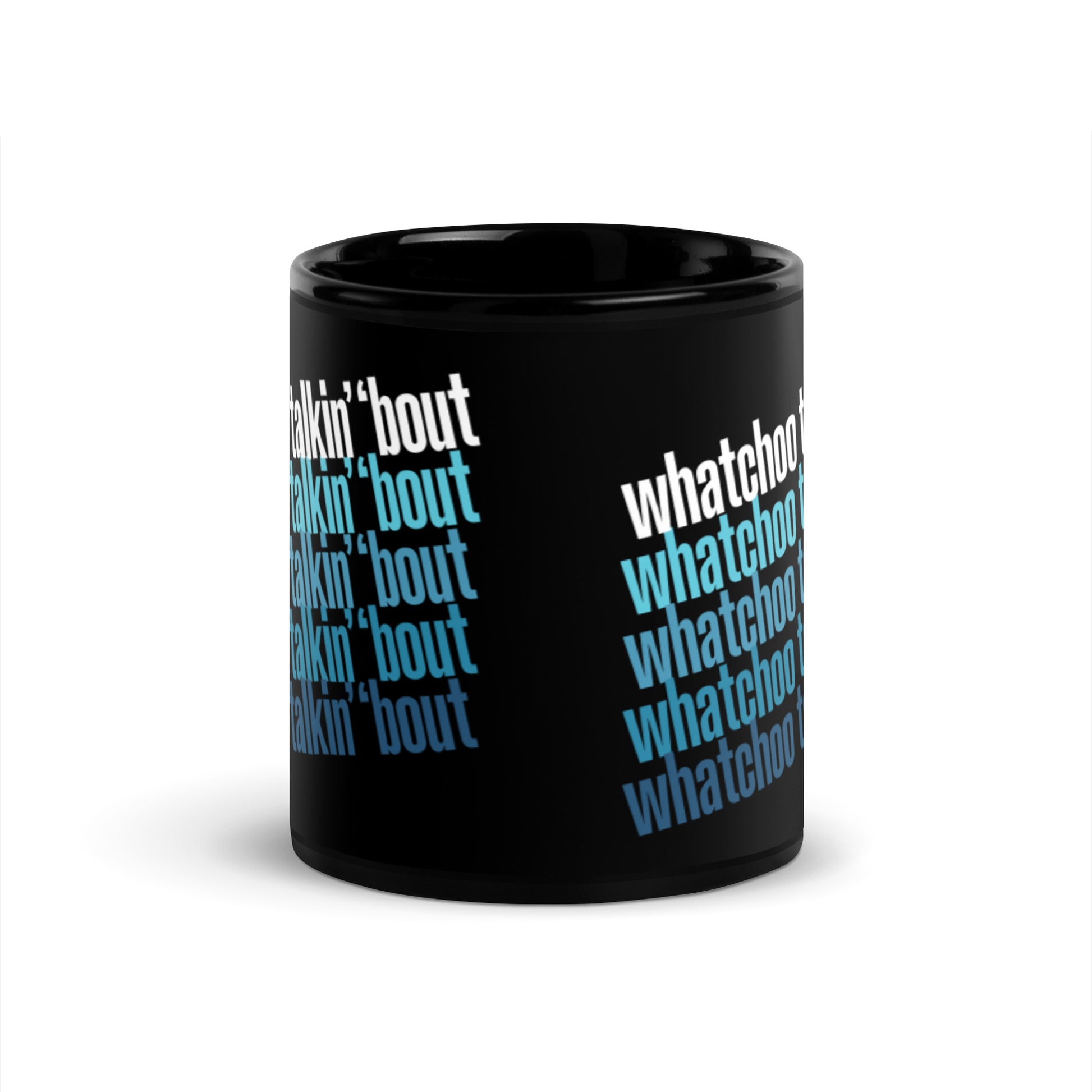 "Whatchoo Talkin Bout" Black Mug with Blue Repeat Pattern
